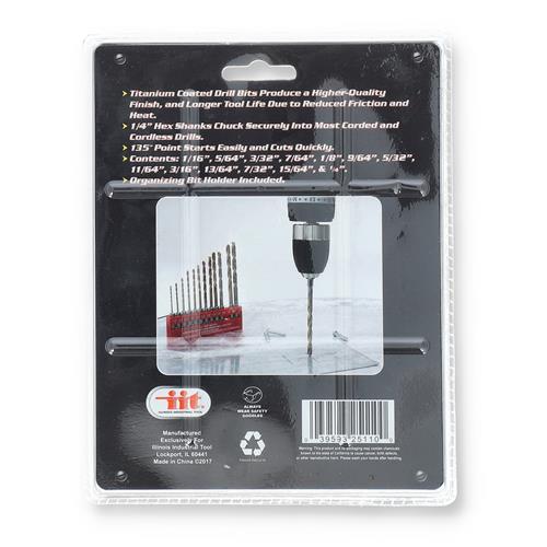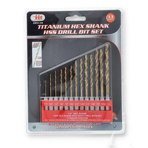 WHOLESALE 13PC HEX SHANK DRILL BIT SET Titanium coated drill bits produce a higher quality finish due to reduced friction & heat. Spur point ensures accurate positioning and quick penetration. Spade point ensures accurate positioning and quick penetration. Spade bits make crisp clean holes through wood projects. 1/4 inch inch hex shanks can be used with cordless tools.Illinois Industrial Tools